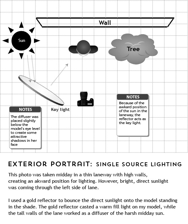 This photo was taken midday in a thin laneway with high walls, creating an akward position for lighting. However, bright, direct sunlight was shining through the left side of lane. I used a gold reflector to bounce the direct sunlight onto the model standing in the shade. The gold reflector also casted a warm light on my model, while the tall walls of the lane worked as a diffuser of the harsh midday sun.